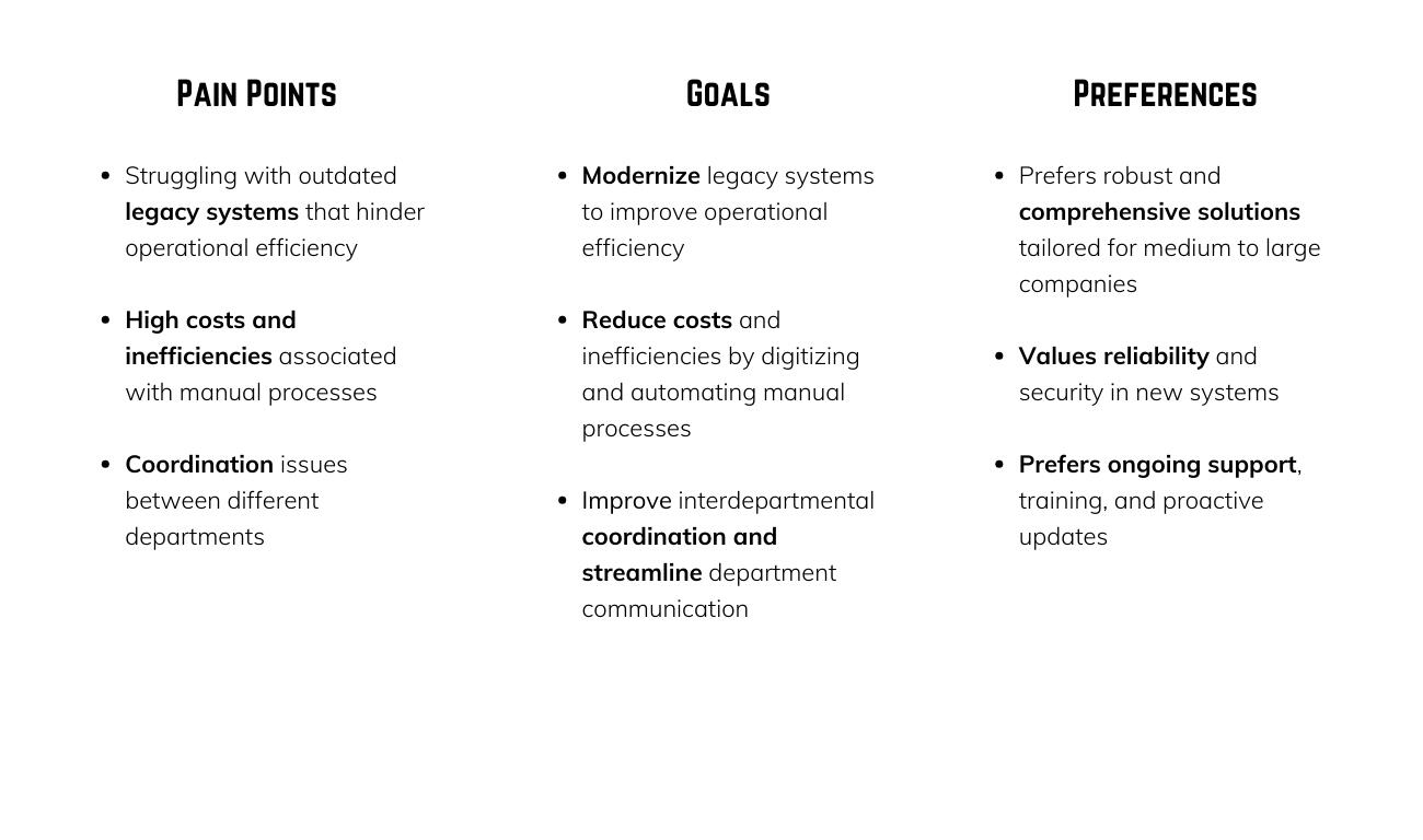 Doppelgänger: a fictional representation of our clients, designed to help us understand and address specific needs more effectively. Click on yours to see how our tailored solutions can benefit your business.